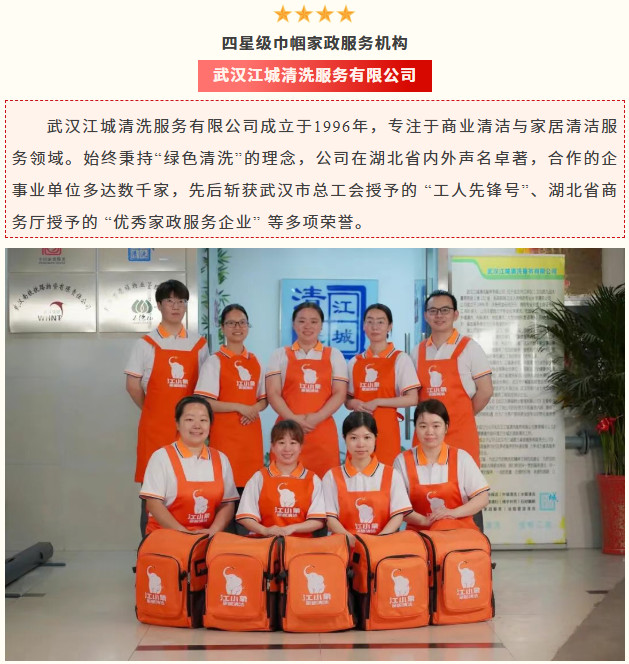 本次評定依據《家政服務機構等級劃分及評定》國家標準、《巾幗家政服務機構評價》團體標準的有關規定,并按照《全國婦聯辦公廳關于開展全國巾幗家政服務機構評價申報工作的通知》相關要求,經自主申報和綜合評估確定。該榮譽標志著江城清洗在服務標準化、運營專業化、管理規范化等方面已達到全國行業先進水平。