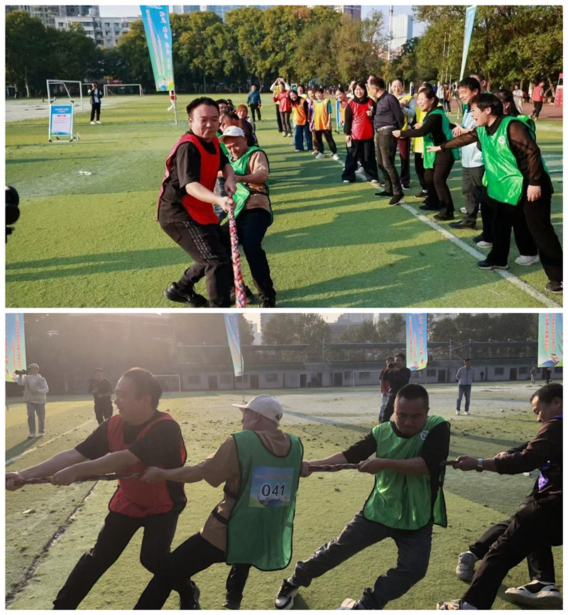拔河比賽現場尤為激烈,隊員們腳抵著腳、肩并著肩,迅速形成合力,啦啦隊員齊聲助威,吶喊聲此起彼伏,大家緊緊擰成一股繩,全力以赴,賽出了健康、快樂,更展現了團結、和諧的精神。